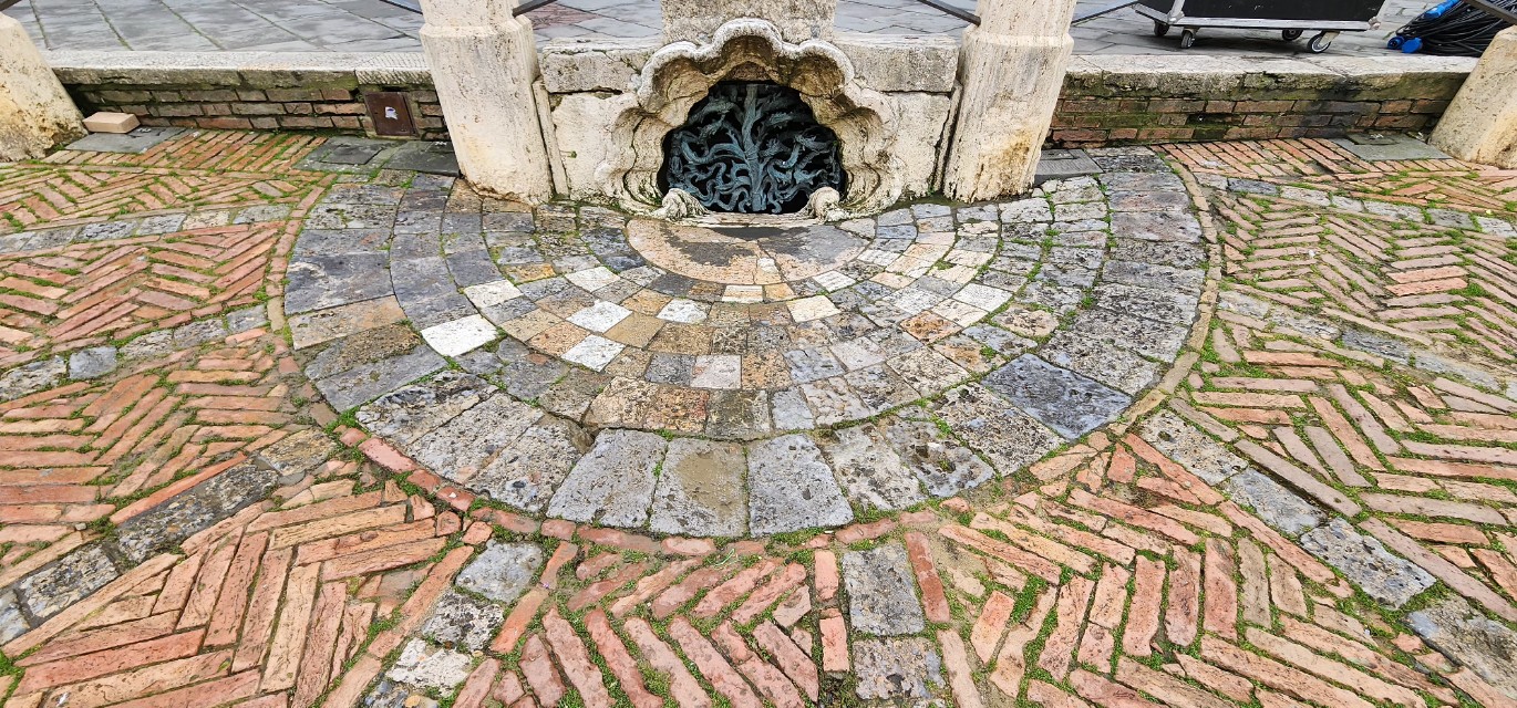 바닥은 붉은 벽돌과 흰 트라버틴 선으로 아홉 개의 부채꼴 구역으로 나뉘어 있다.