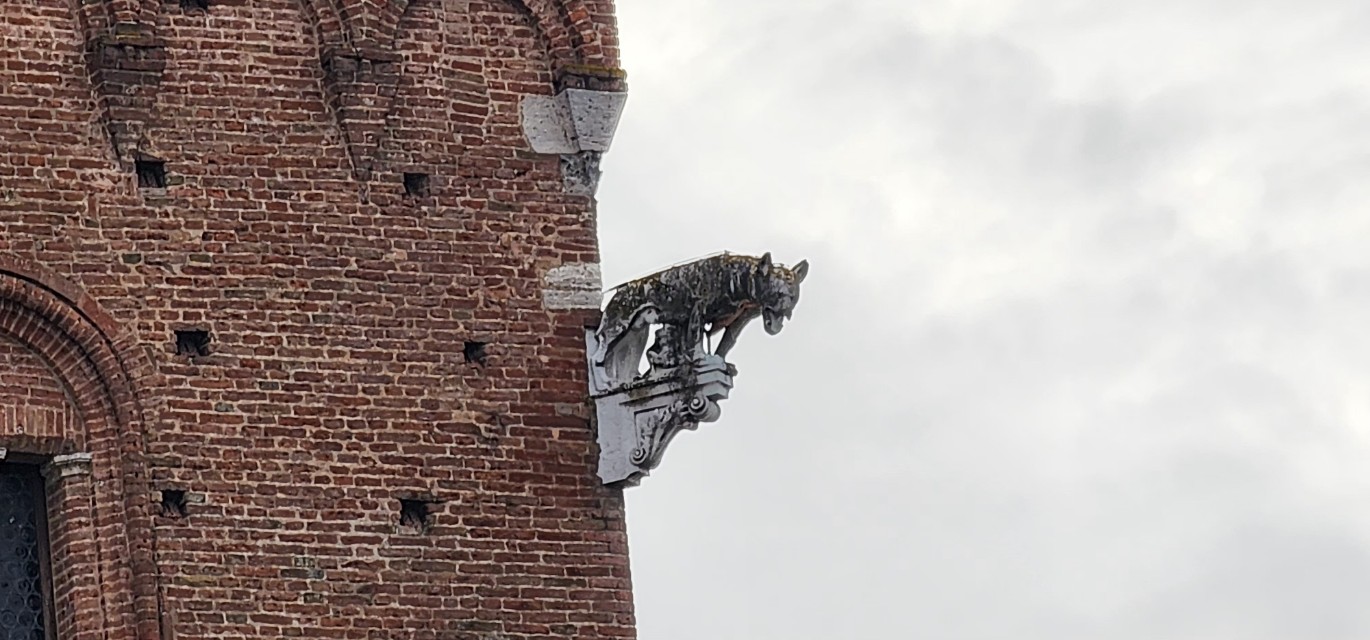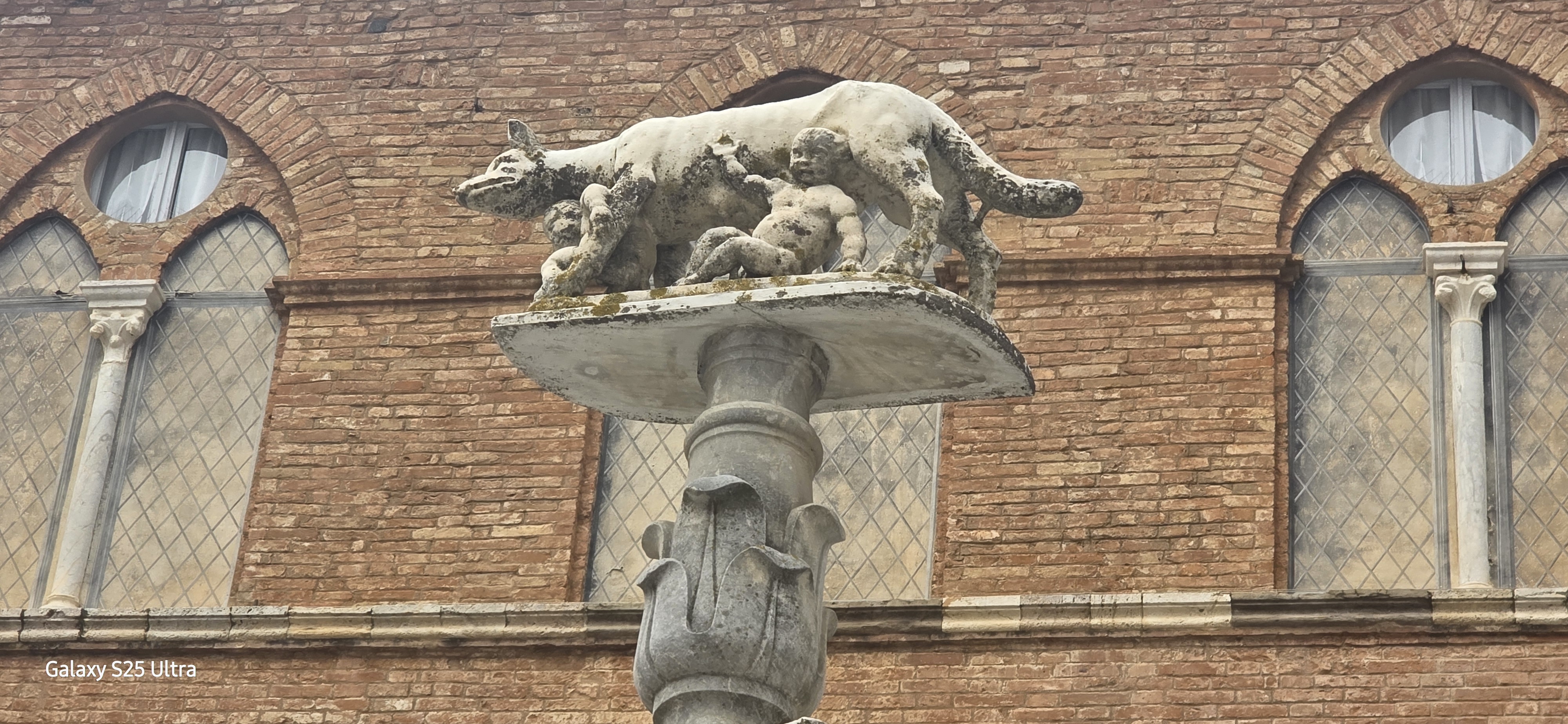 시에나 자체가 로마 건국 신화(로물루스와 레무스)에서 이어진 도시라는 전설이 있어서, 레무스의 두 아들인 세니우스와 아스키우스가 이곳에 와서 도시를 세웠다고 한다. 이들이 로마에서 늑대 조각상(수유하는 늑대 상)을 훔쳐 와 시에나에 모시고 도시의 수호 상징으로 삼았다는 이야기가 있고, 그래서 대성당 주변과 종탑 근처 장식에도 로물루스·레무스·암늑대 상징이 반복된다.