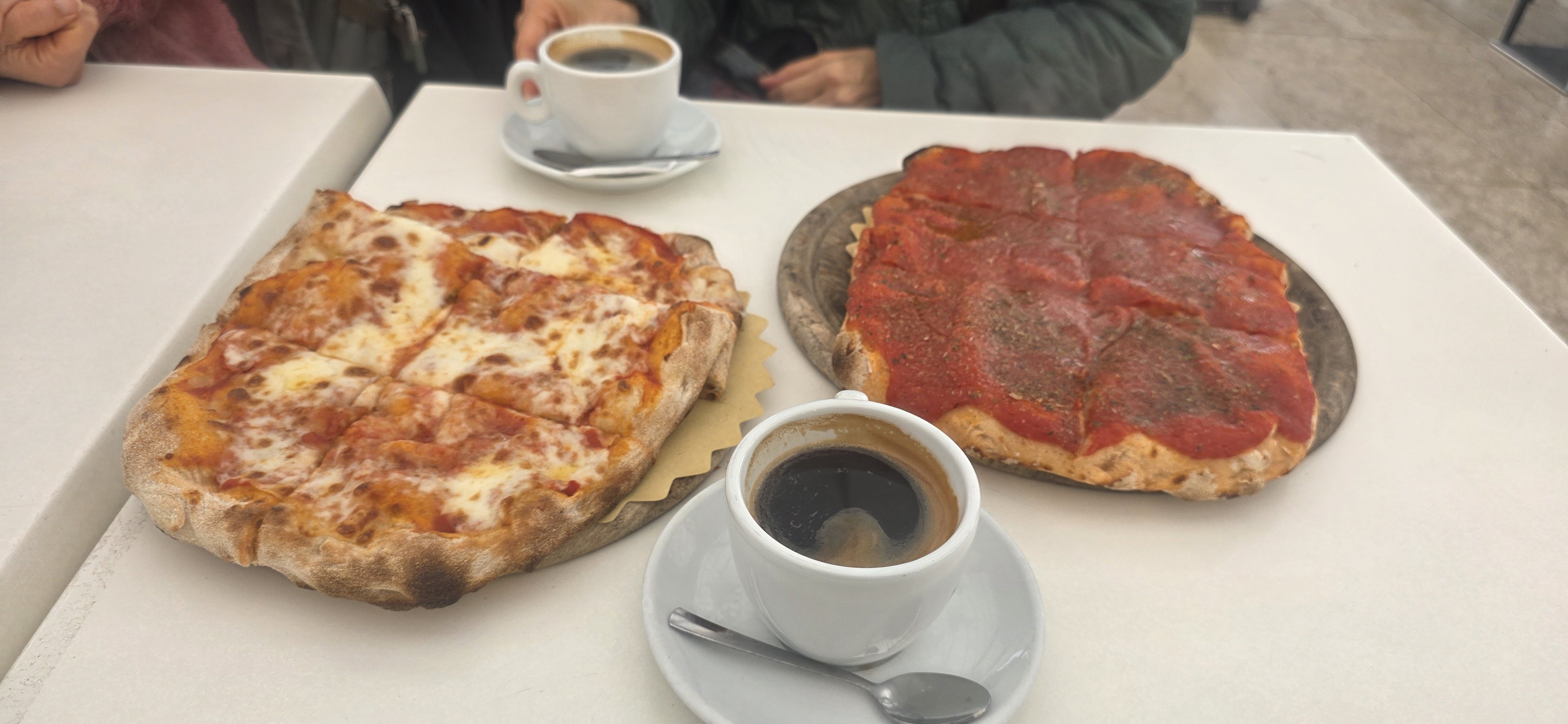카페를 찾아 커피와 피자를 시켜 먹으며