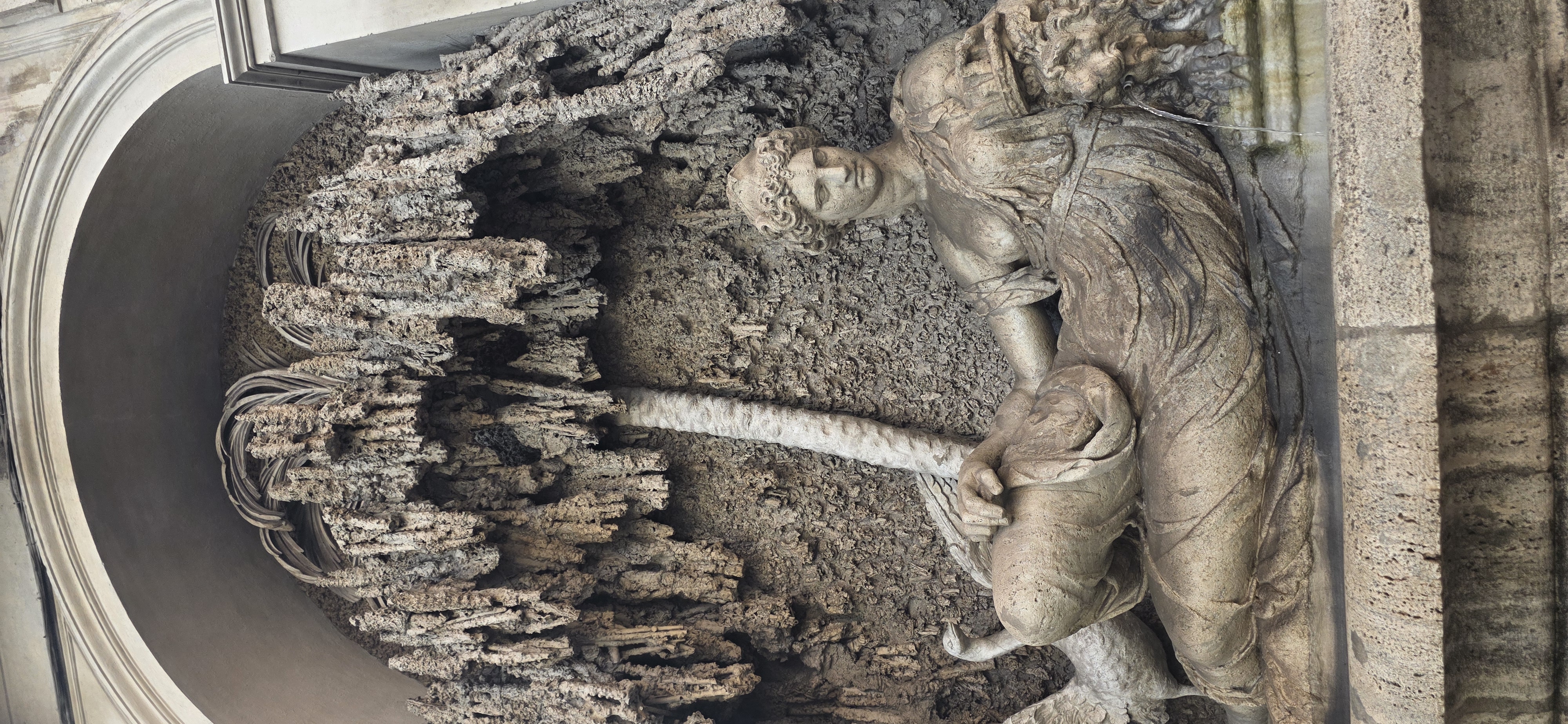 이는 옆 국립로마박물관에 있는 고대 조각처럼 팔·다리가 결손된 형상을 의도적으로 반영해, 상처 입었지만 부활로 새로워지는 인류를 상징한다고 설명된다.